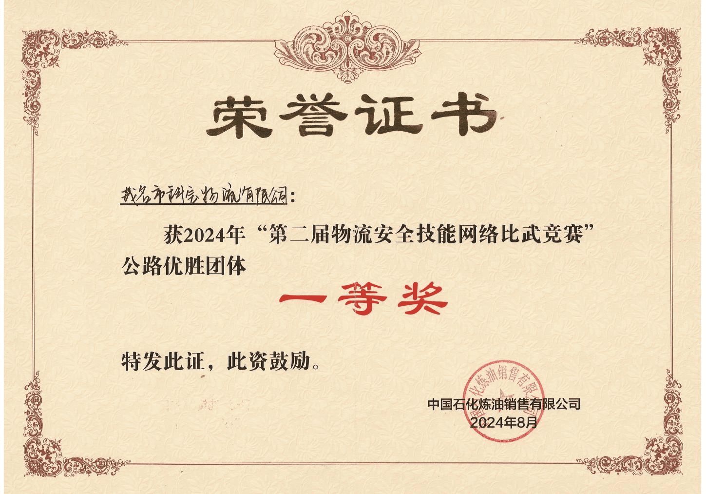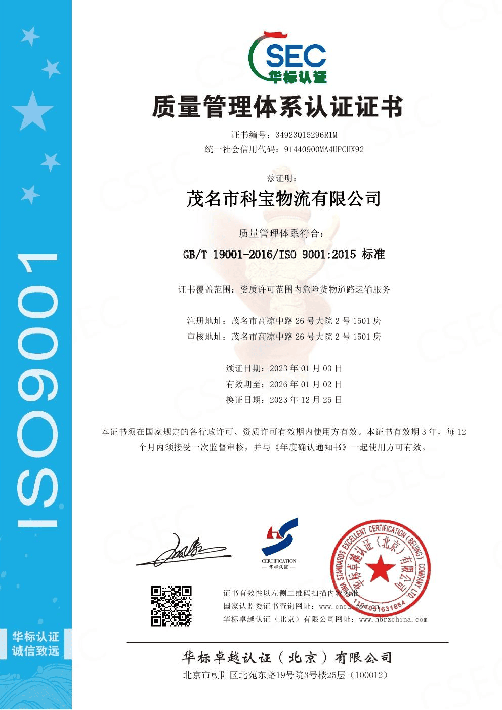 In January 2020, the company established ISO9001 quality management system, ISO45001 occupational health and safety management system, and ISO14001 environmental management system. In August 2020, the company obtained the third level certification for standardized construction of safety production in transportation enterprises and obtained the certificate. In 2024, the company was elected as a supervisory unit of the Maoming Dangerous Goods Transport Association. The company is equipped with an all-weather Beidou intelligent monitoring system to achieve visual tracking of the entire transportation process. Regularly conduct safety training and emergency drills for drivers and escorts, with a 100% certification rate.