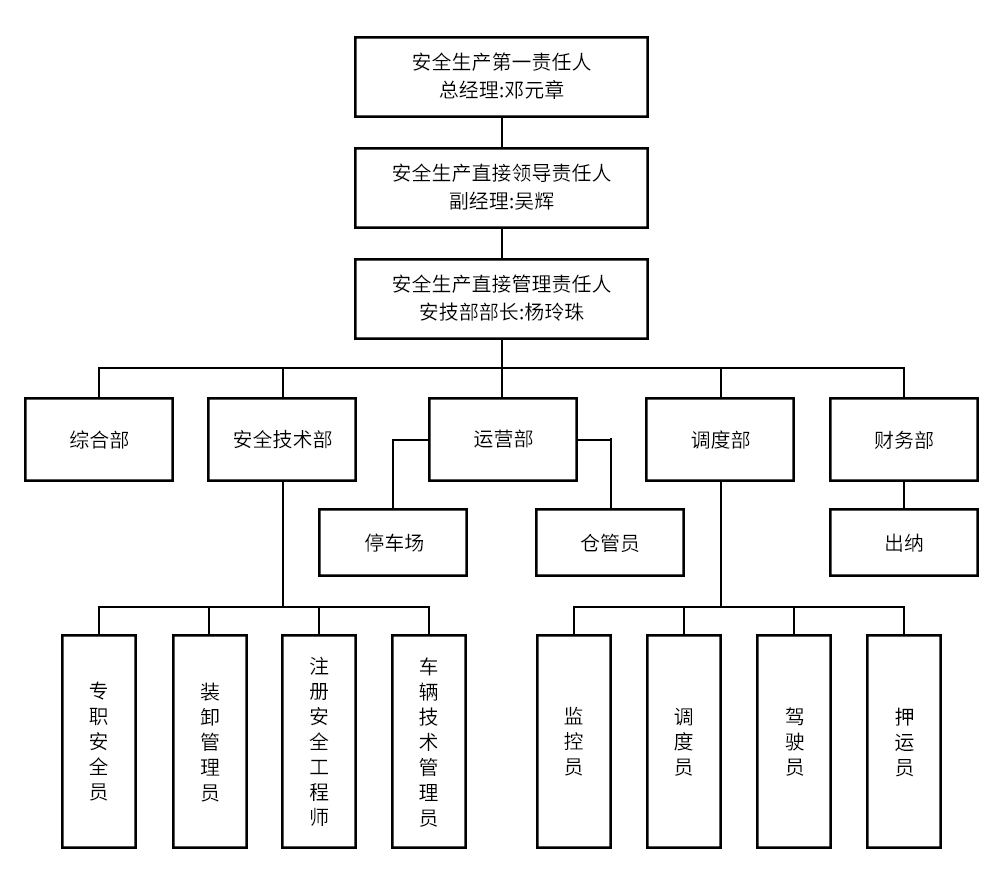 公司组建了严谨的安全生产管理组织结构,设有综合部、财务部、调度部、安技部、运营部五个部门。
