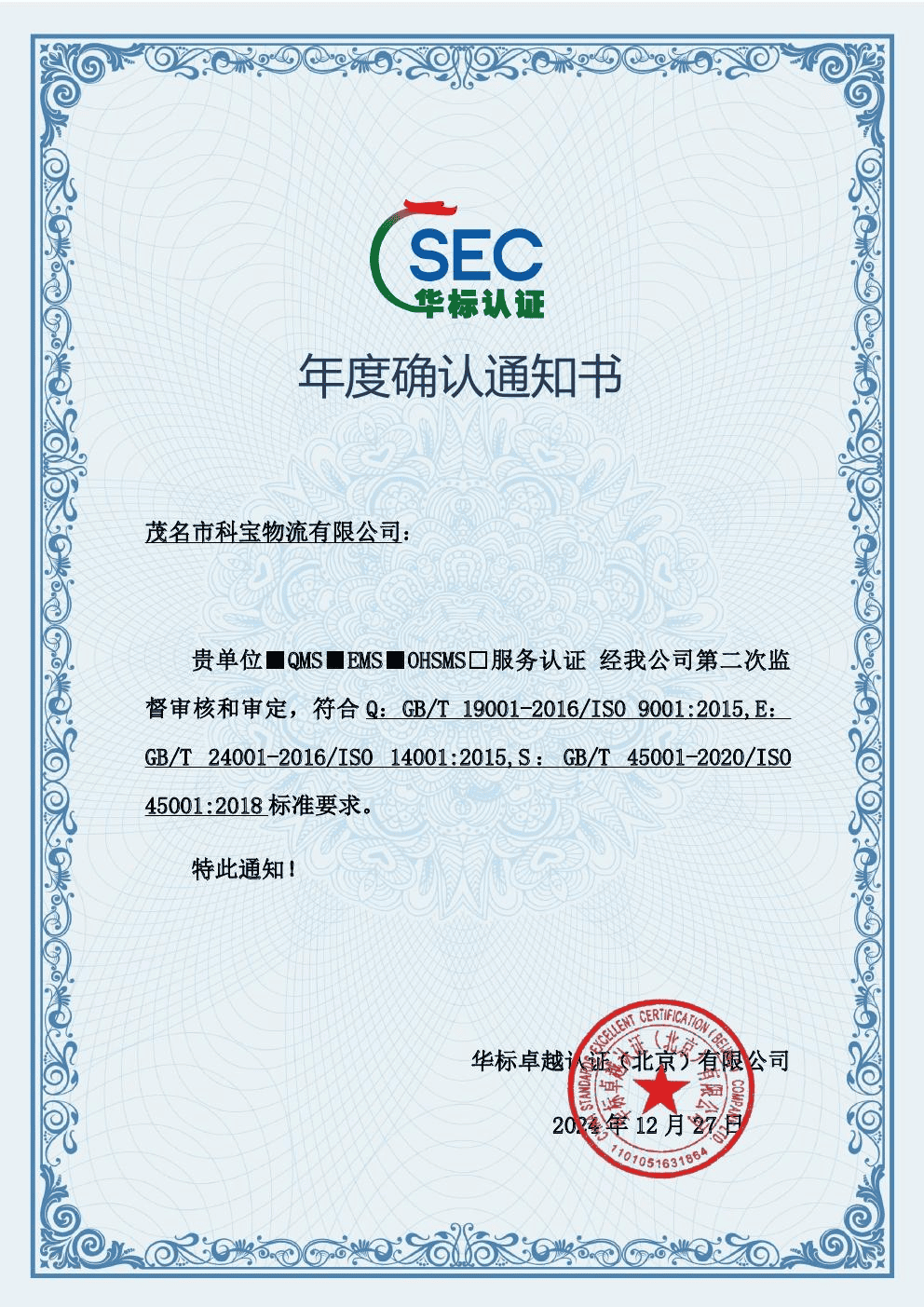 环保管理体系认证证书
