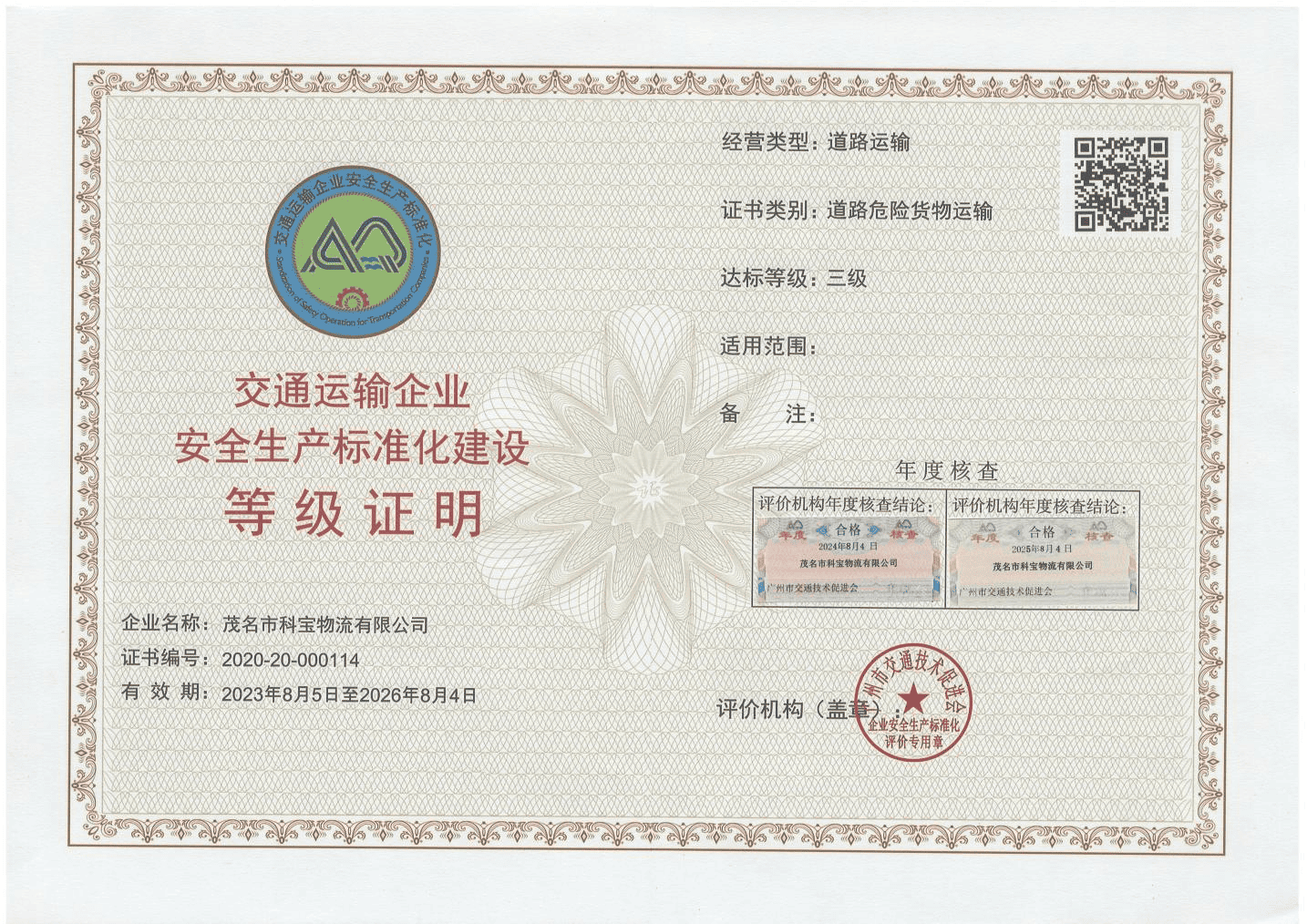 交通运输企业安全生产标准化建设等级证书