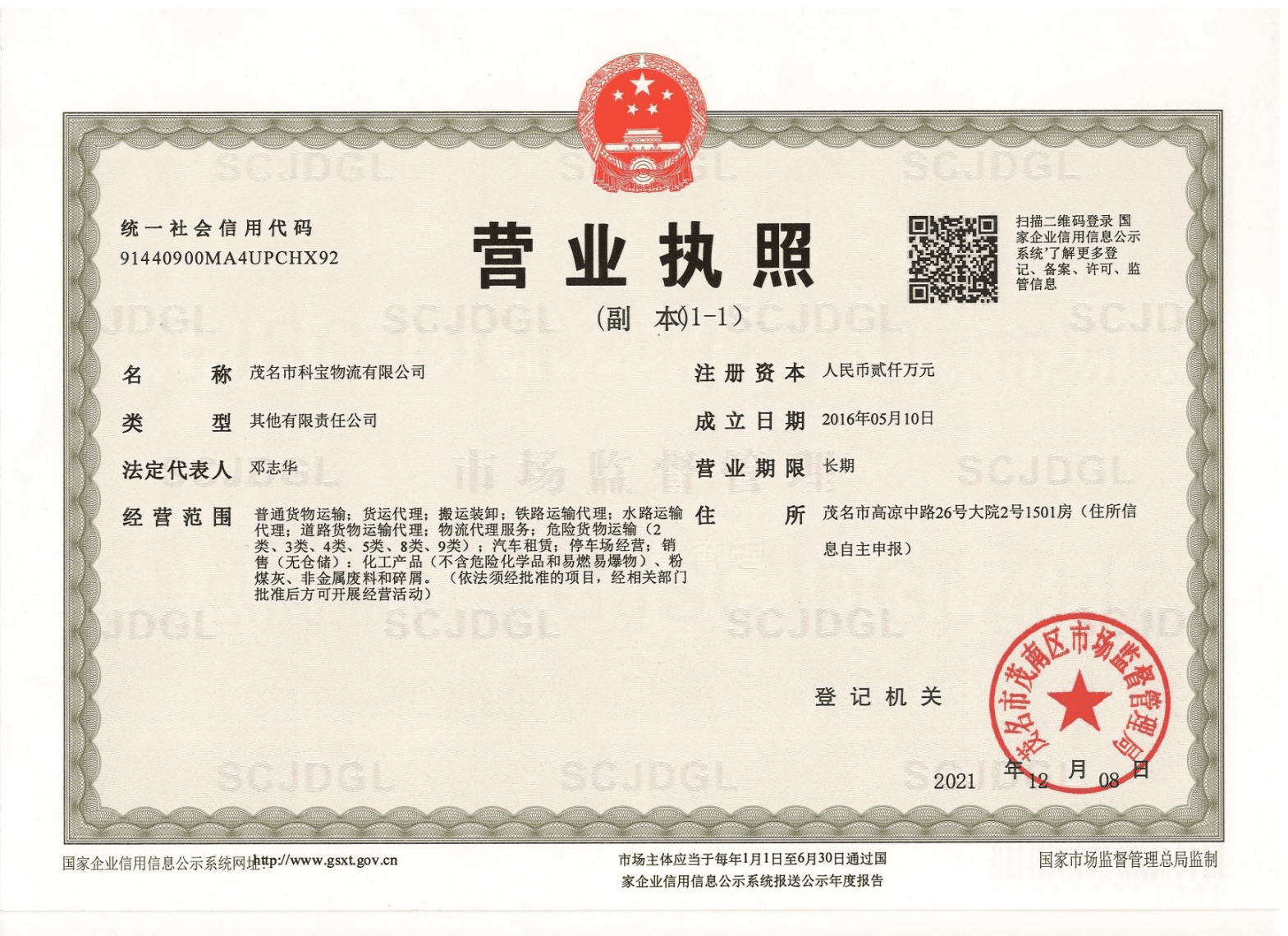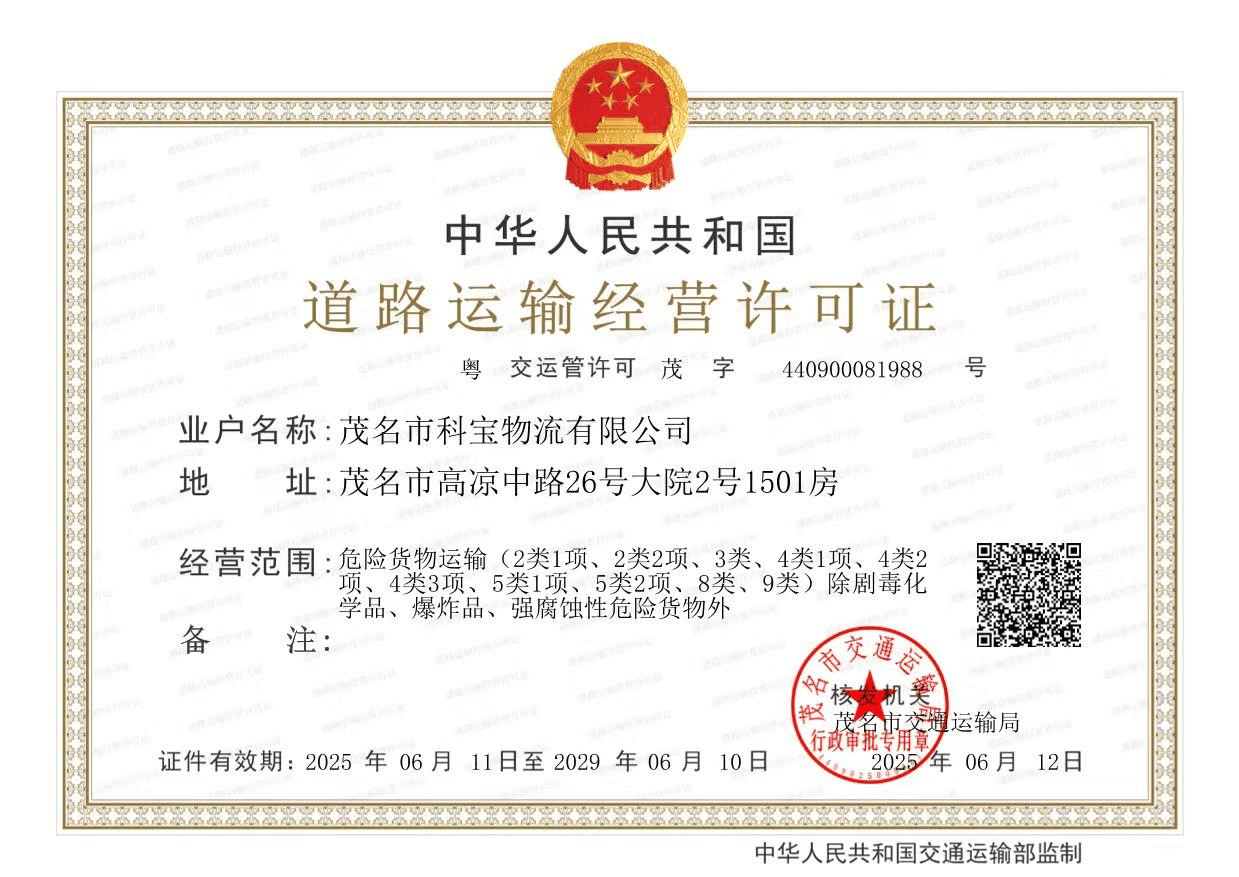 茂名市科宝物流有限公司是一家由广州石化改制企业广州市广石物流有限公司全资危险 货物运输子公司,成立于 2016 年 5 月,是一家具有独立法人资格的民营运输企业,注册资本 贰仟万元整。公司经营范围为:道路货物运输(不含危险货物);道路货物运输(网络货运); 水路普通货物运输;道路危险货物运输;公共铁路运输;水路危险货物运输;省际普通货船 运输、省内船舶运输;公共航空运输。(依法须经批准的项目,经相关部门批准后方可开展 经营活动,具体经营项目以相关部门批准文件或许可证件为准)一般项目:总质量 4.5 吨及 以下普通货运车辆道路货物运输(除网络货运和危险货物);道路货物运输站经营;国内货 物运输代理;国内集装箱货物运输代理;铁路运输辅助活动;物料搬运装备销售;装卸搬运; 运输货物打包服务;智能物料搬运装备销售;运输设备租赁服务;包装服务;汽车零配件批 发;租赁服务(不含许可类租赁服务);化工产品销售(不含许可类化工产品);专用化学 产品销售(不含危险化学品);轻质建筑材料销售;普通货物仓储服务(不含危险化学品等 需许可审批的项目)【分支机构经营】;航空运输货物打包服务【分支机构经营】;停车场 服务【分支机构经营】。(除依法须经批准的项目外,凭营业执照依法自主开展经营活动)。